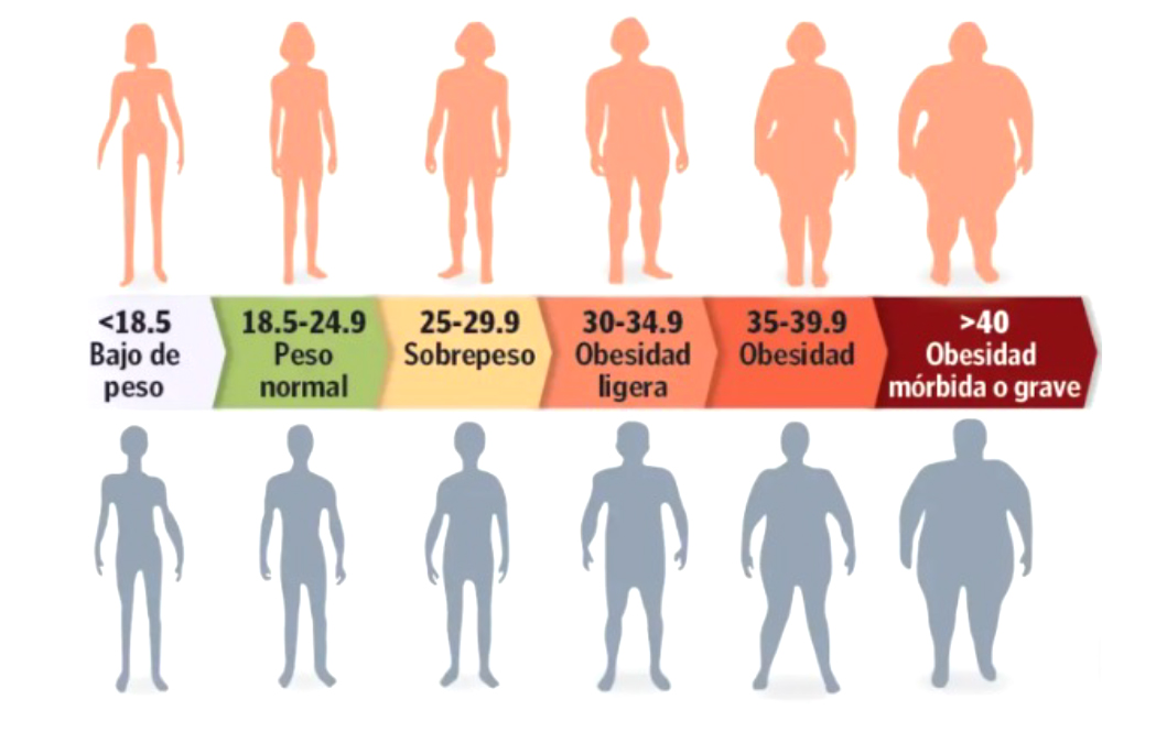 Para conocerlo la Organización Mundial de la Salud (OMS), toma en cuenta la estatura (talla) y el peso, mediante la división de estas dos medidas antopométricas, usando la fórmula del IMC (índice de masa corporal). IMC= peso (Kg)/ talla (m)2 ; por ejemplo si peso 69 kg y mi estatura es de 1.60 m, el resultado es un IMC de 26.95, me dirijo a la tabla para interpretar mi resultado. Es importante indicar que este no hace una diferencia del porcentaje de grasa corporal existente, aplica para mujeres y hombres adultos; mientras que en niños es distinto, en ellos tomamos en cuenta la edad, estatura, sexo, e IMC manejando tablas de referencia, motivo por el cual es necesario acudir a un profesional capacitado.